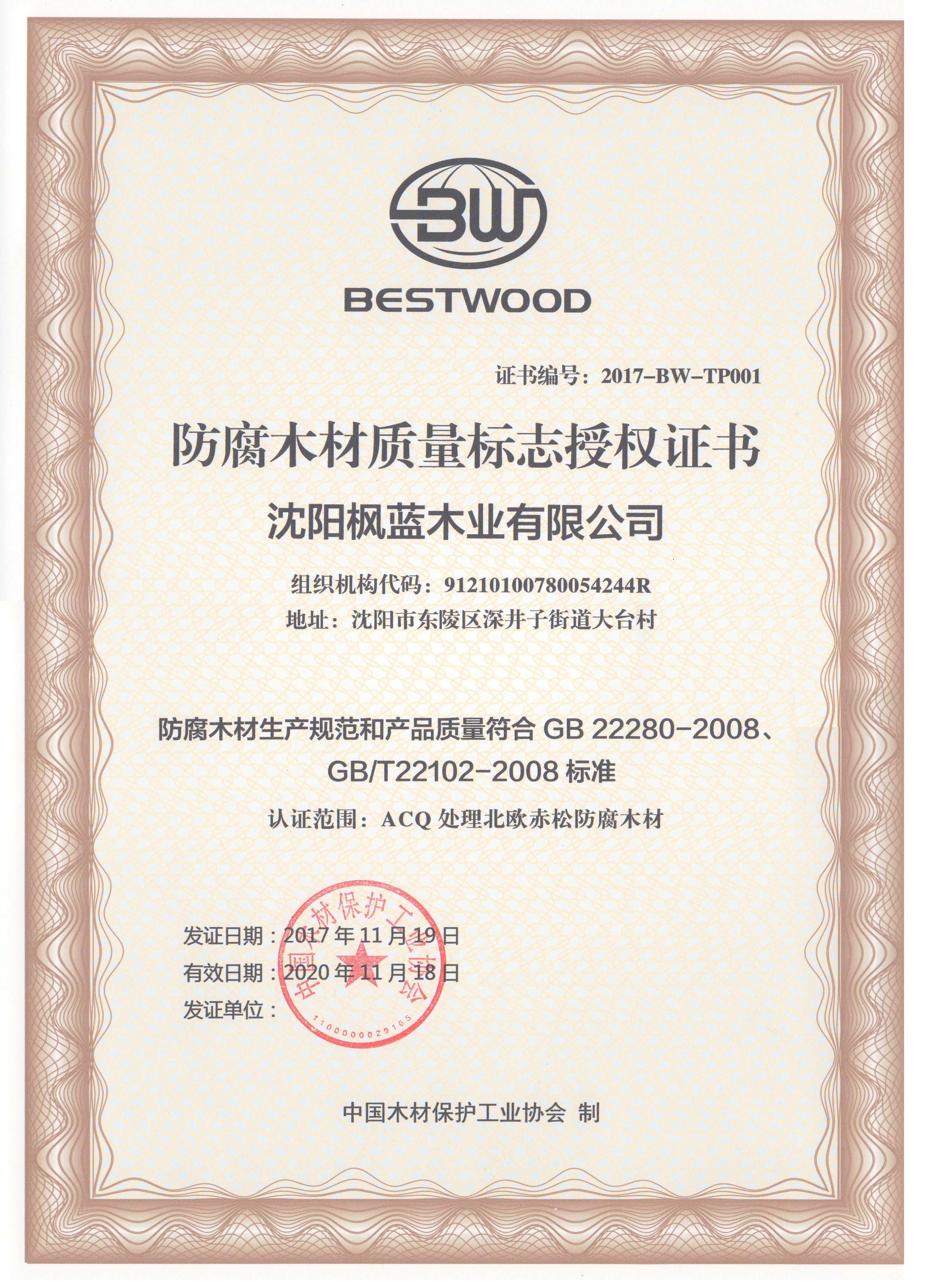 除此之外,楓藍(lán)木業(yè)還積極推動(dòng)行業(yè)發(fā)展,參與多項(xiàng)國(guó)家標(biāo)準(zhǔn)的制定工作,而且在2017年,公司“扣板/防腐木/炭化木”產(chǎn)品被列入CWSA中國(guó)木結(jié)構(gòu)產(chǎn)業(yè)聯(lián)盟“佰家優(yōu)品”推廣目錄 ;楓藍(lán)木業(yè)也是國(guó)內(nèi)首批通過中國(guó)木材保護(hù)工業(yè)協(xié)會(huì)防腐木材質(zhì)量標(biāo)志認(rèn)證的企業(yè)之一!